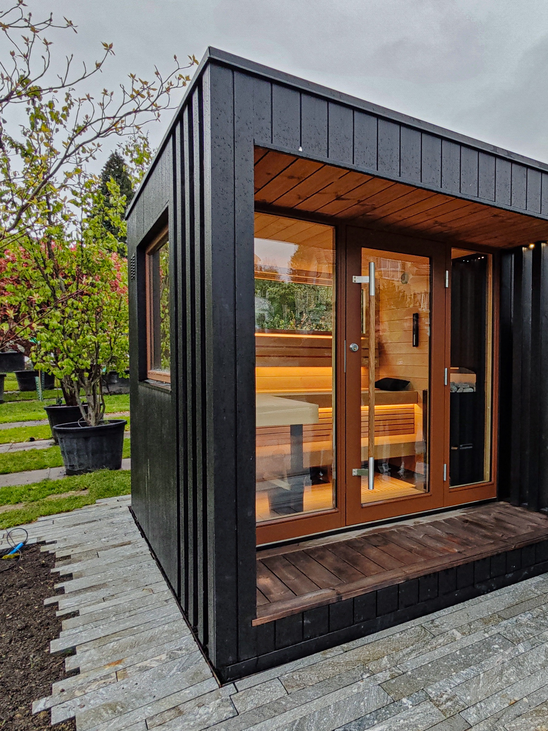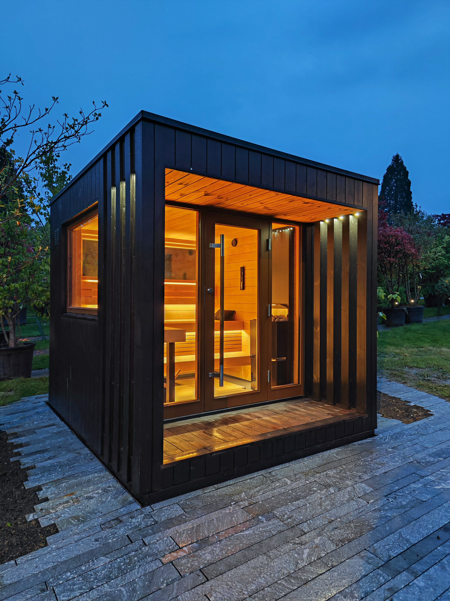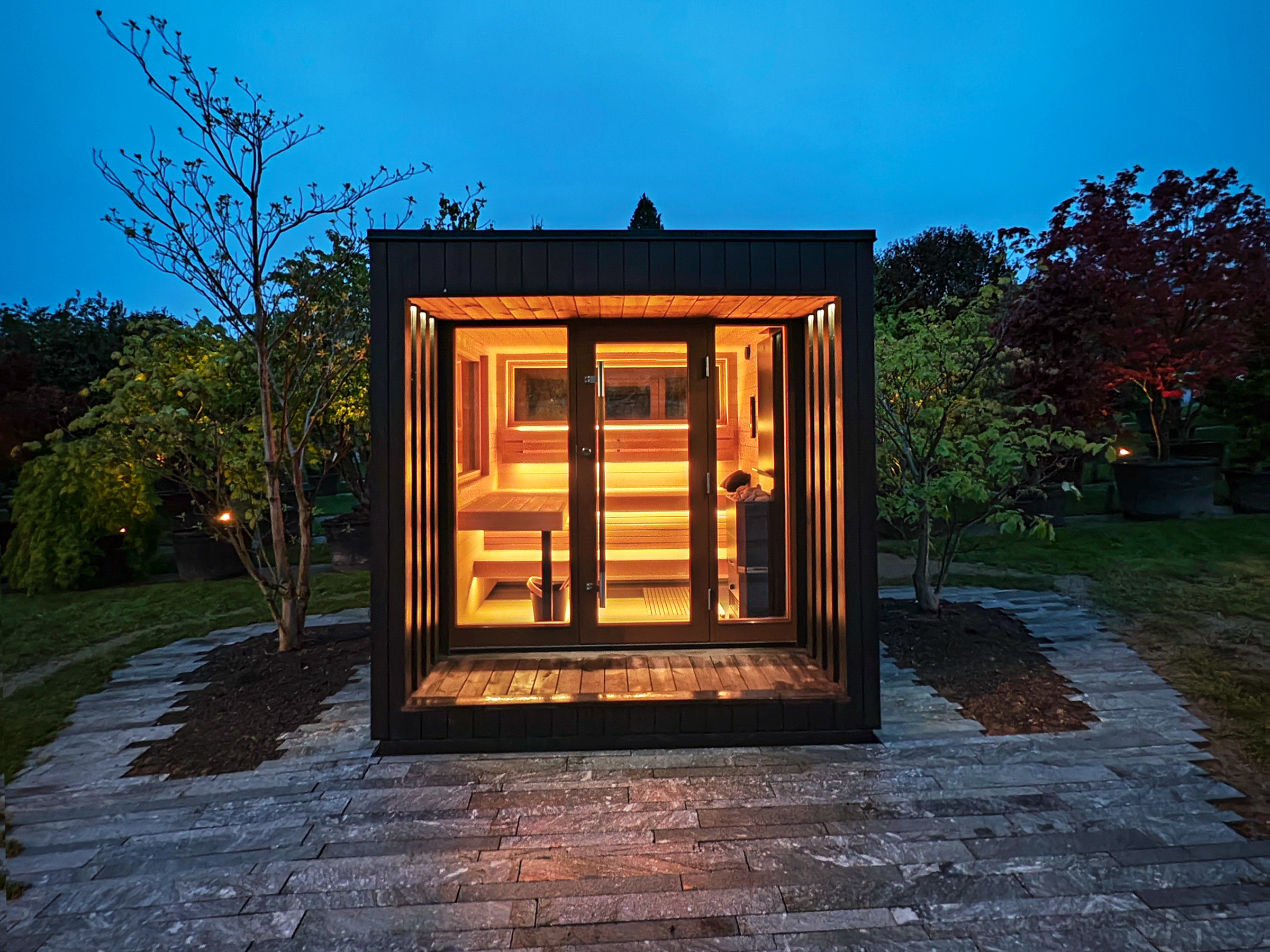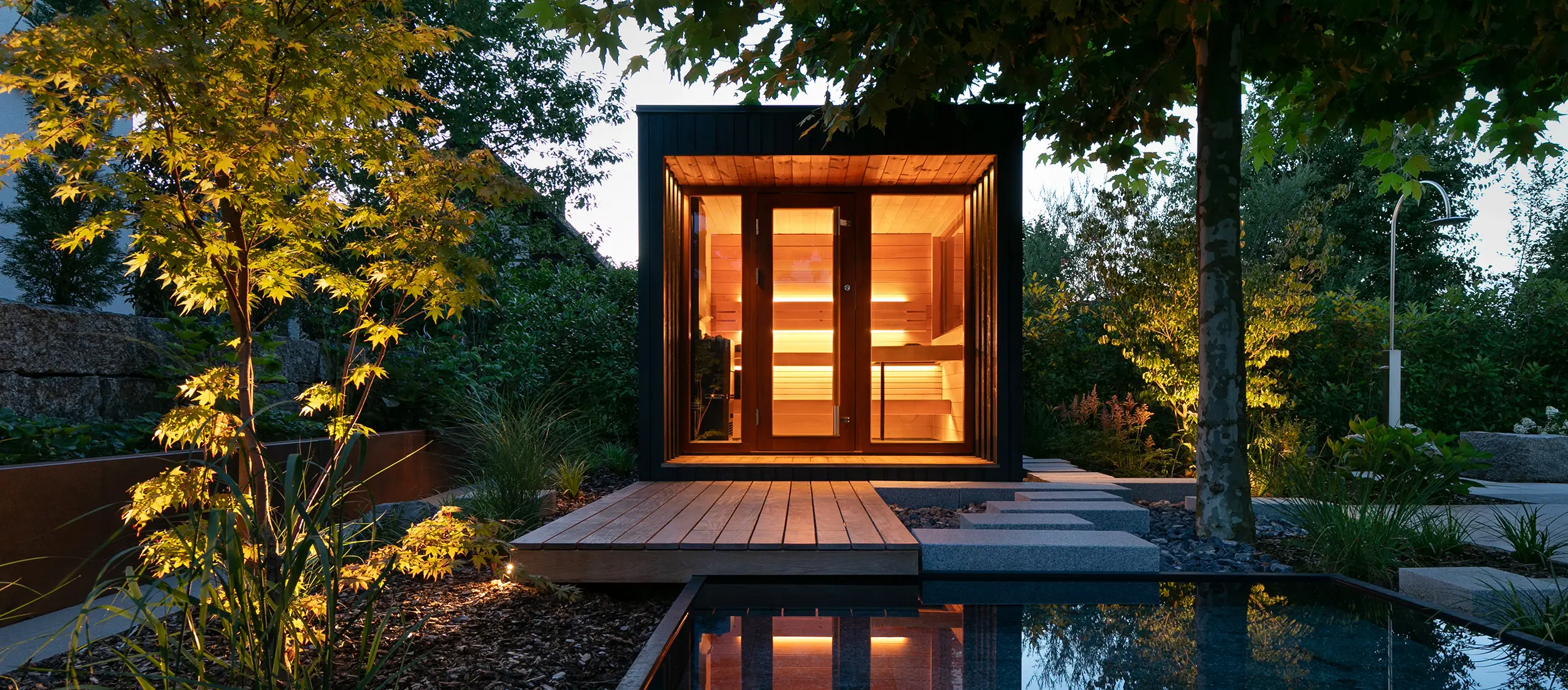 Möchten Sie Ihre Gartenwelt auch in den Herbst- und Wintertagen geniessen? Eine Aussensauna in moderner Gartengestaltung schafft ein privates Paradies, in dem Sie auch in der kalten Winterzeit entspannen und neue Energie tanken können. Geniessen Sie die wohlige Wärme und den Blick in den verschneiten Garten – ein unvergleichliches Wellness-Erlebnis. Die Kombination aus klaren Linien, natürlichen Materialien und innovativer Technik macht die Aussensauna zum Blickfang und zur Oase der Ruhe.