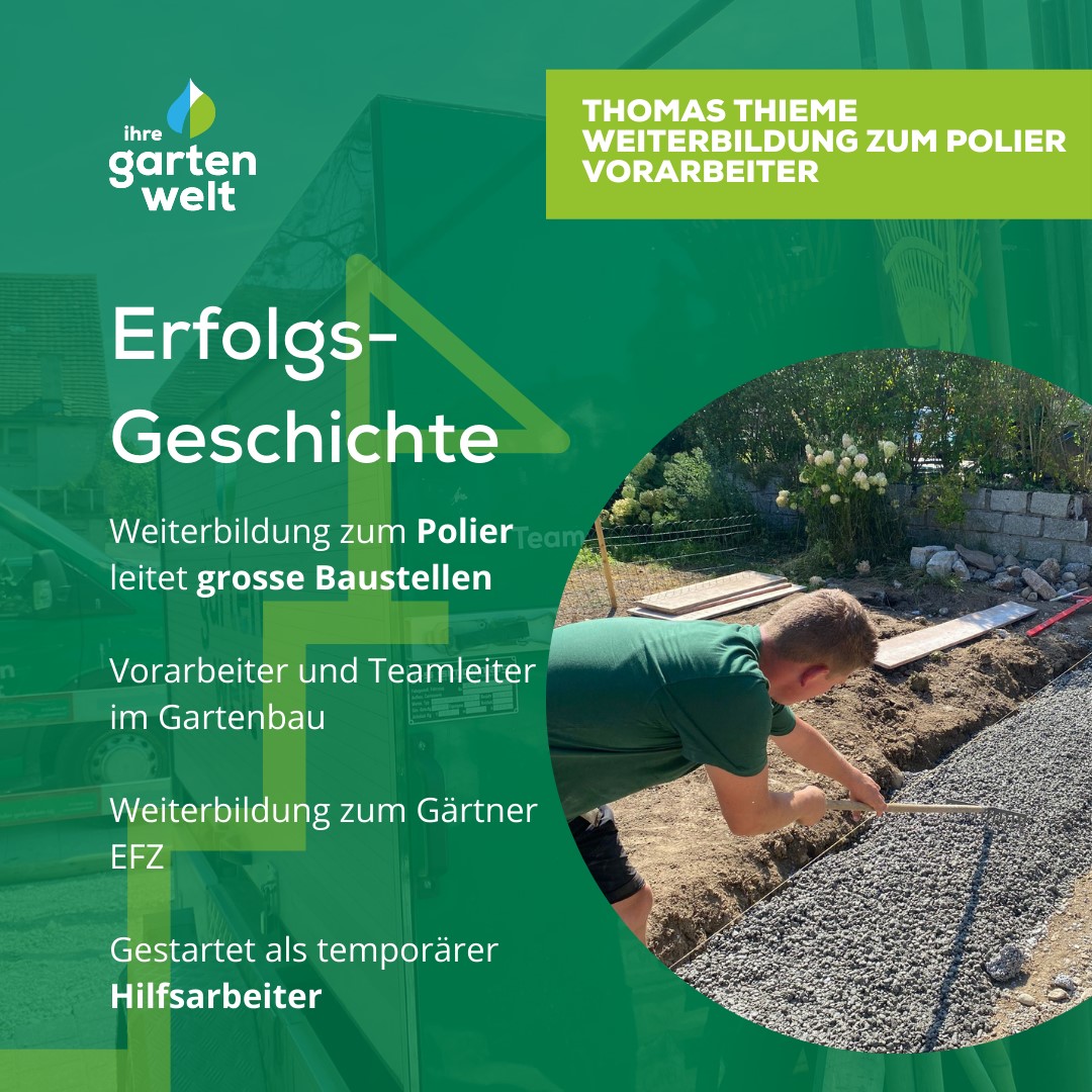 Thomas kam als temporärer Hilfsarbeiter in unser Team. Seitdem hat er sich zum Gärtner EFZ weitergebildet und leitet als Vorarbeiter Teams und eigene Baustellen. Heute macht er seine Weiterbildung zum Polier und führt grössere Baustellen. Mit seinem Team erschafft er Garten(t)räume.