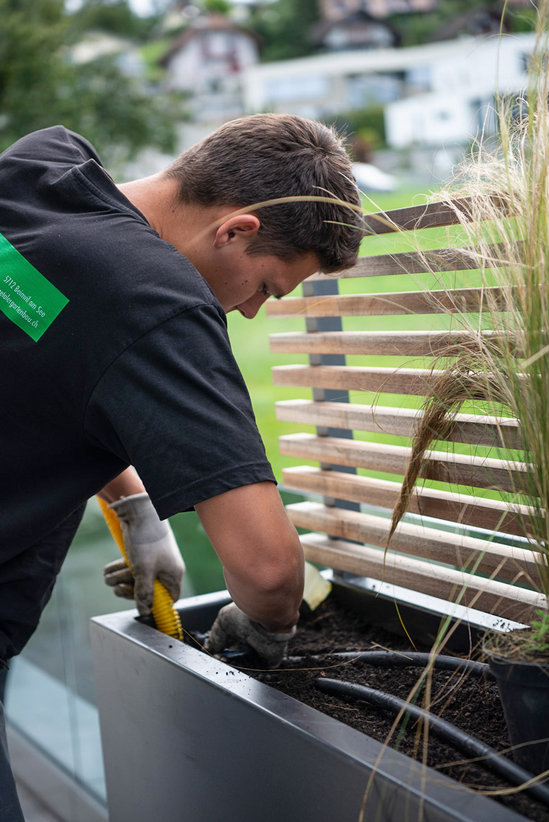 Pflanzen in Trögen und Gefässen oder auch in Rabatten müssen regelmässig und richtig bewässert werden, damit sie gut gedeihen. Clevere Bewässerungssysteme mit Feuchtigkeitssensor stimmen die Bewässerung mit dem Wetter ab und geben Ihnen sorgenfreie Unabhängigkeit, auch wenn Sie mal unterwegs sind. Eine automatische Bewässerung lässt sich übrigens auch problemlos für den Rasen einrichten – gerne sind wir mit unserem Fachwissen für Sie da.