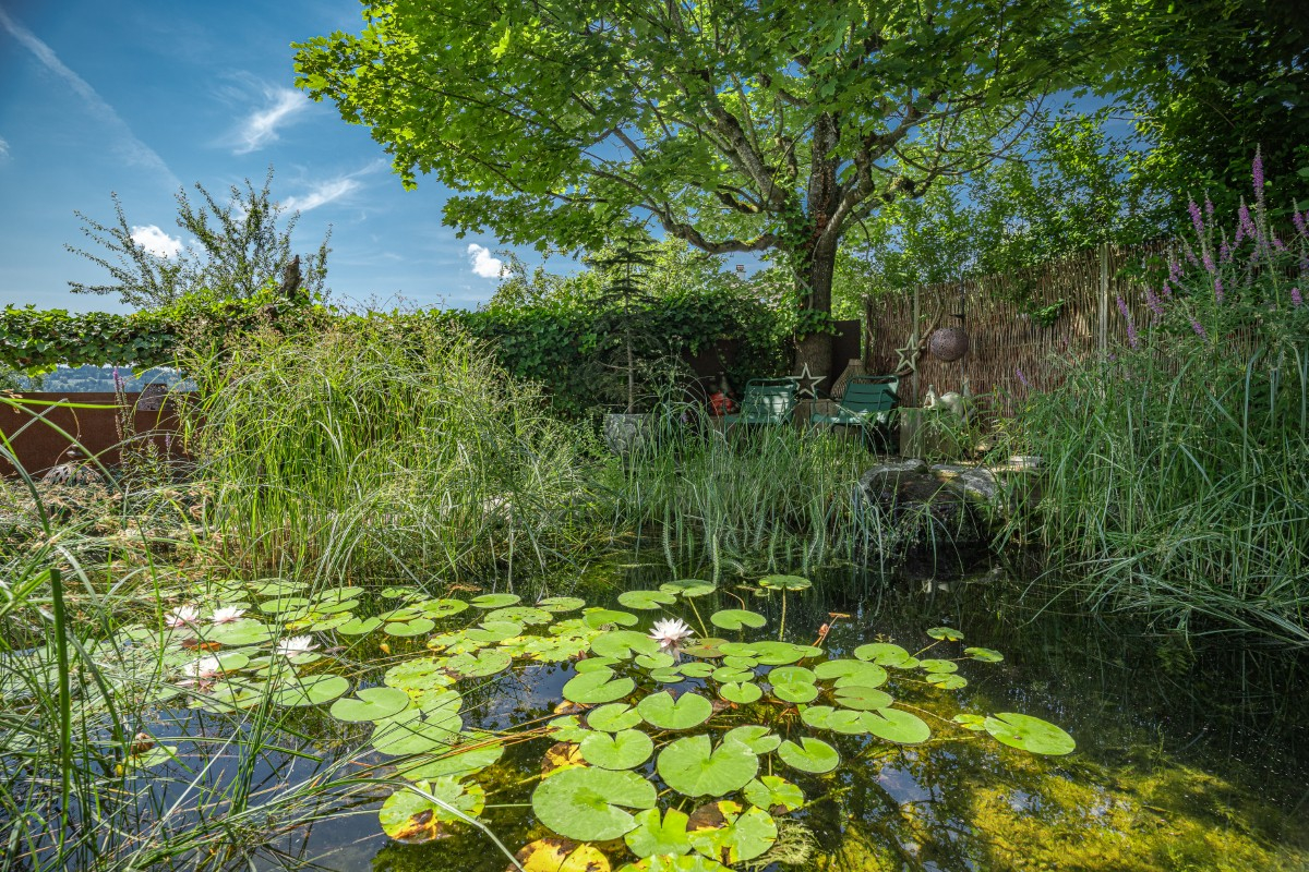 Auch ein Gartenteich lädt Besucher zum Schwimmen ein: Wasserläufer, Molche, Frösche und Kröten leben gerne am und im Teich, Libellen fliegen elegant darüber hin und wenn man Glück hat, findet ein Eisvogel den Weg ans hauseigene Biotop. Der Fundus an einheimischen Sumpf- und Wasserpflanzen ist gross und Namen wie Froschlöffel, Krötenlilie, Sumpffarn und Teichrose sind Programm. Ein Gartenteich passt perfekt in einen Naturgarten und lässt sich wunderbar im Liegestuhl beobachten und geniessen.