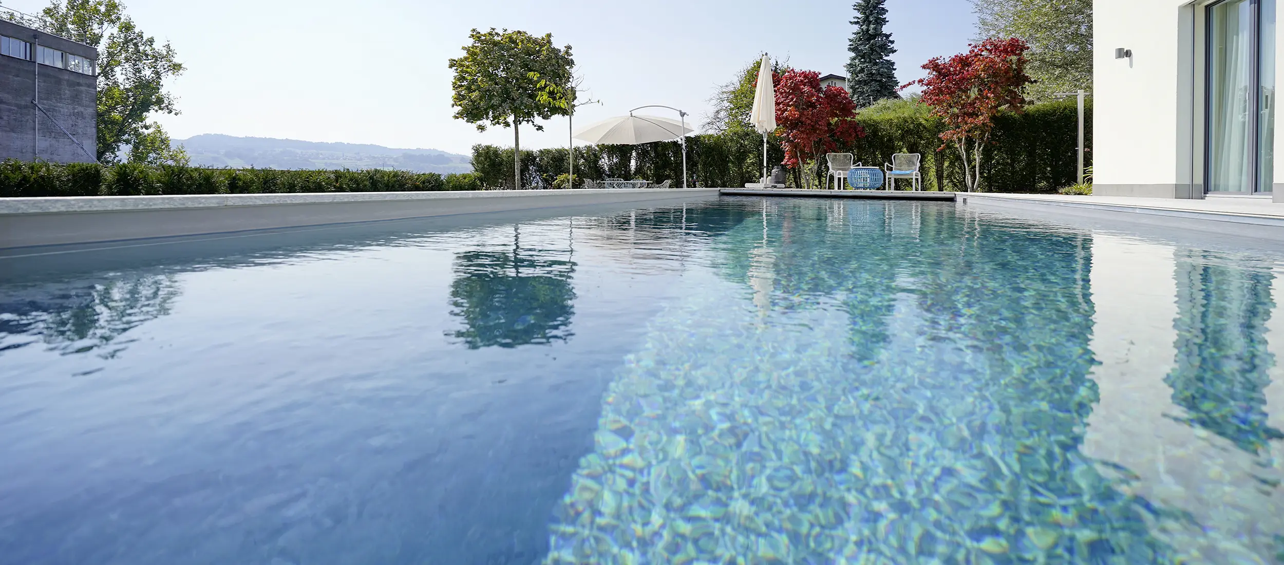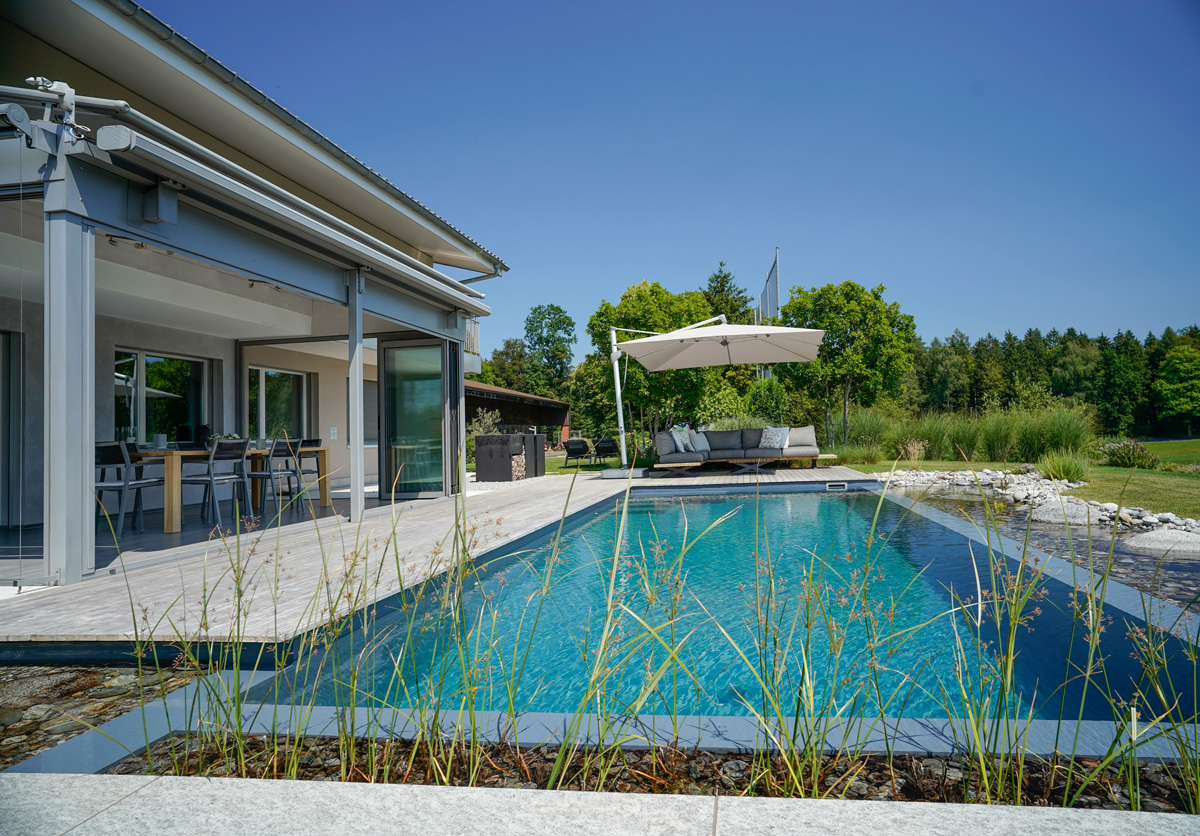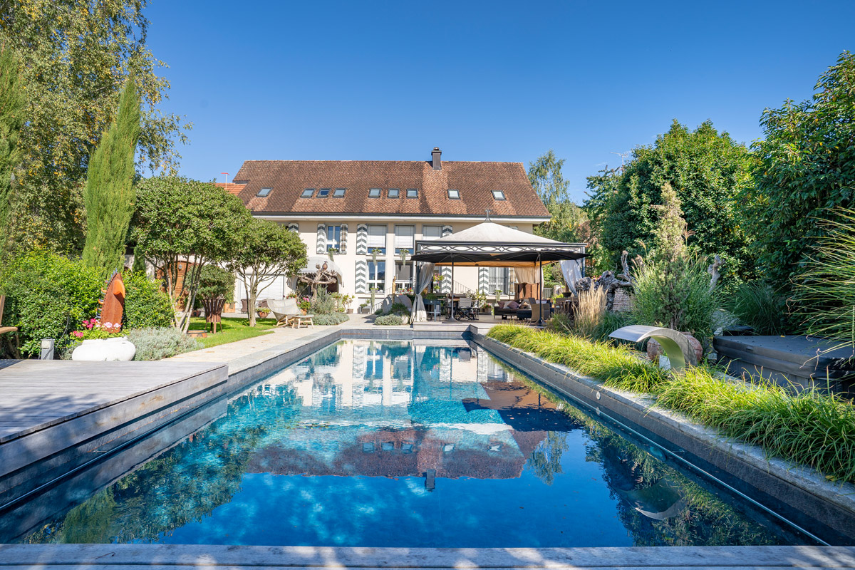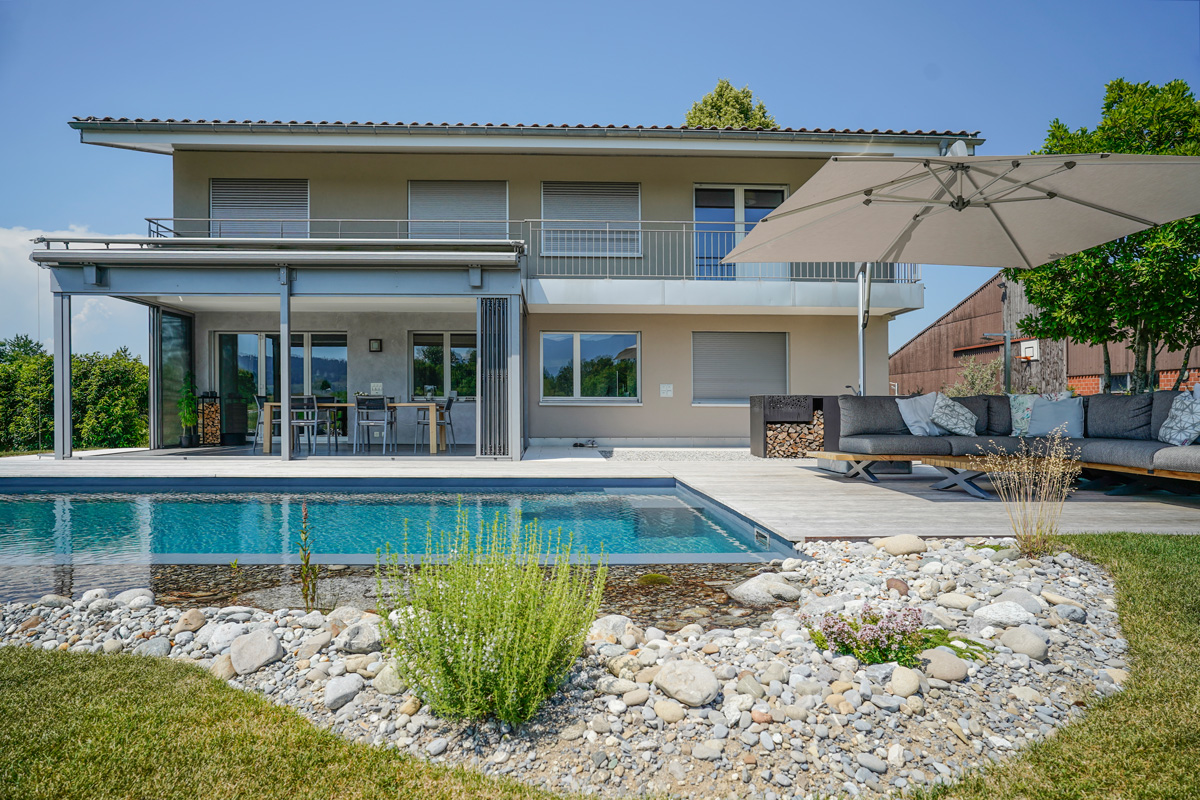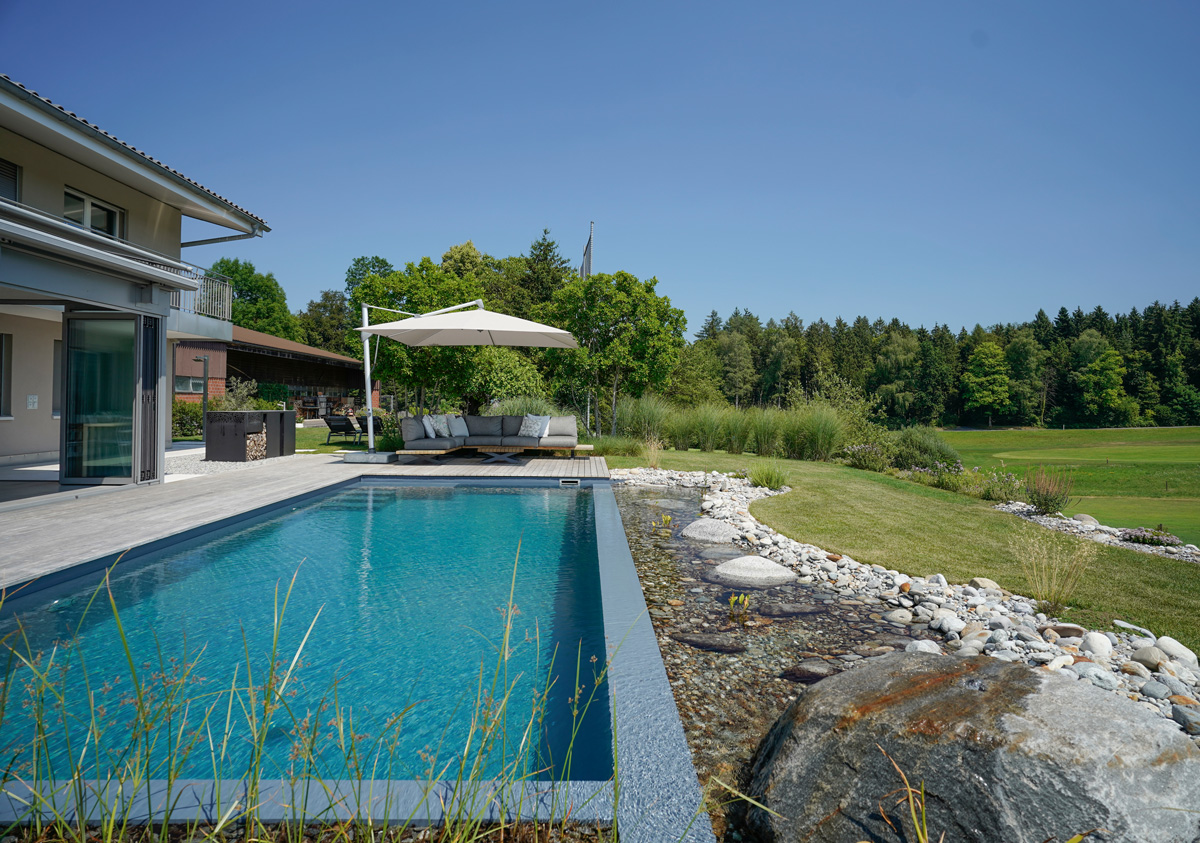 Hinter dem Ausdruck «Pool» verstecken sich noch viele weitere Möglichkeiten: Ein Salzwasserpool zum Beispiel ist eine tolle Alternative zum herkömmlichen, chlorgereinigten Pool. Das Salzwasser ist gut für die Haut und reizt die Augen nicht, und das Naturprodukt hält den Pool ebenso sauber wie Chlor. Und wer gerne noch etwas Massage und Licht dazu hat: Mit einem Whirlpool oder C-Side-Pool besitzen Sie Ihr ganz persönliches Home-Spa. Wir beraten Sie gerne.
