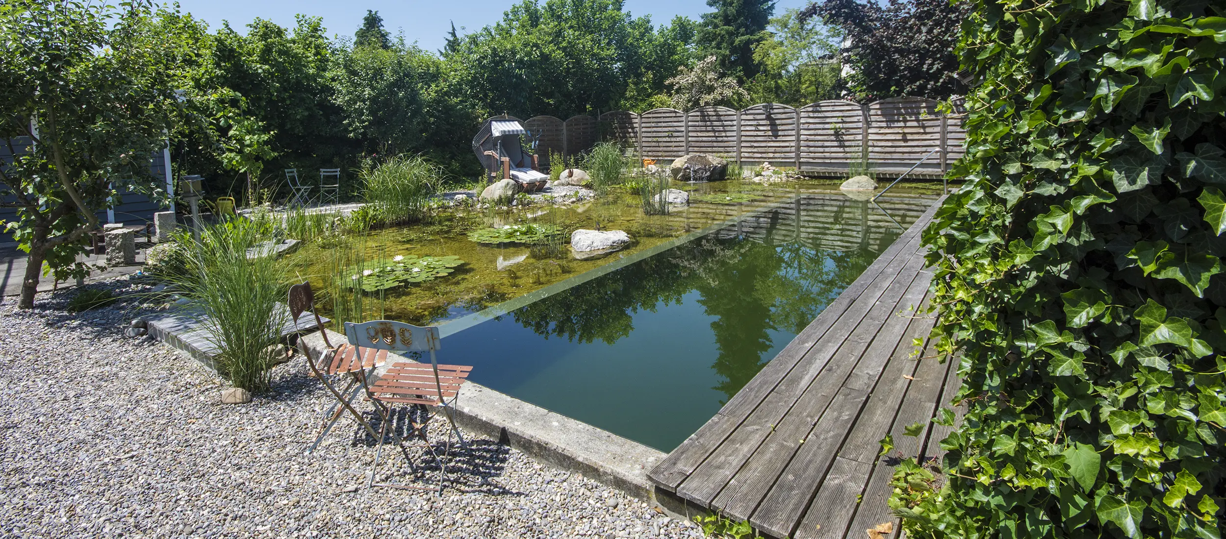 Wer einen Badepool haben möchte, der sich möglichst harmonisch in einen Garten einfügt und auch ohne Technik auskommt, wählt einen Schwimmteich. Hier übernehmen die Pflanzen in einem angegliederten Bereich die Reinigung des Wassers. Zur Unterstützung der Wasserreinigung kann ein zusätzlicher Filter eingebaut werden, was aber nicht zwingend nötig ist. Das Wasser bleibt natürlich frisch und klar und der Schwimmteich passt sich mit seiner Pflanzenwelt dem Wechsel der Jahreszeiten an.