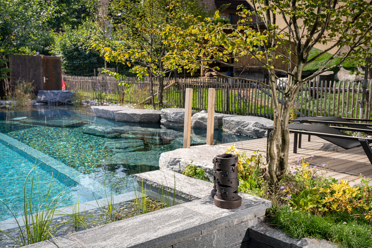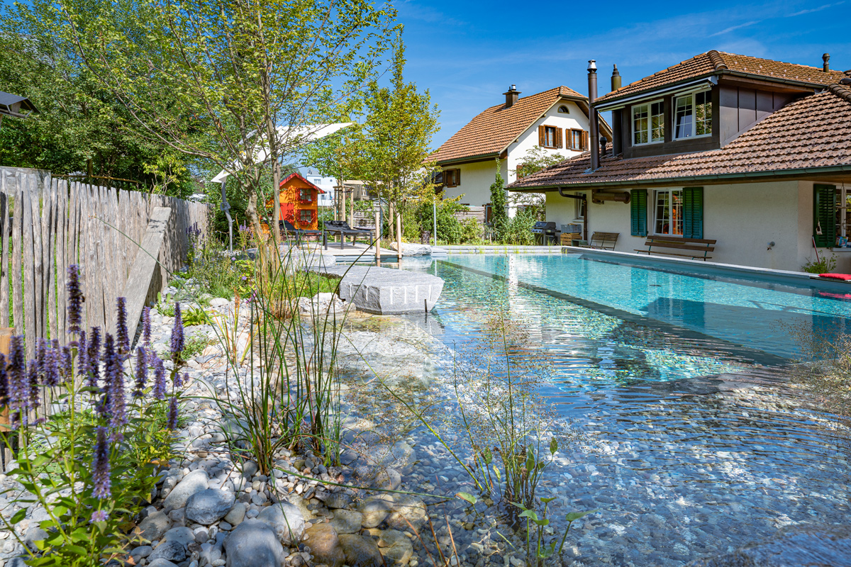 Wer einen Badepool haben möchte, der sich möglichst harmonisch in einen Garten einfügt und auch ohne Technik auskommt, wählt einen Schwimmteich. Hier übernehmen die Pflanzen in einem angegliederten Bereich die Reinigung des Wassers. Zur Unterstützung der Wasserreinigung kann ein zusätzlicher Filter eingebaut werden, was aber nicht zwingend nötig ist. Das Wasser bleibt natürlich frisch und klar und der Schwimmteich passt sich mit seiner Pflanzenwelt dem Wechsel der Jahreszeiten an.